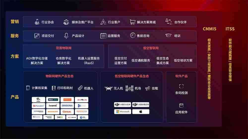 聚合国内外先进的物联网硬件产品品牌,,,,聚焦数字化仓储、、、、机器人运营、、、、低空智联网等领域,,共同打造适合客户业务场景的解决方案并提供交付服务