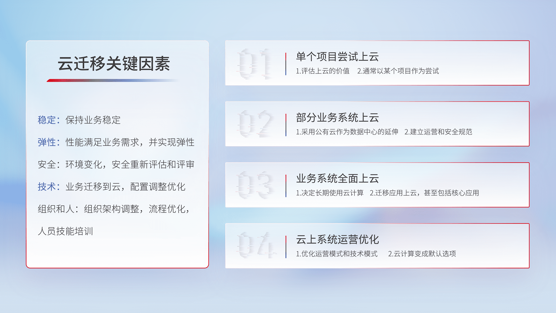 结合实际业务,,,,从规划设计、、云平台选型、、、云原生改造、、、、数据迁移、、、、集成交付,,迁移全过程为客户识别最佳上云路径,,,,做好风险识别管理,,,,设计网络架构、、、、身份权限、、、、安全审计合规、、操作审计、、、、日志审计、、、、监控告警策略、、多站点容灾设计等,,,,对云上基础设施进行整体规划,,,,提升IT治理水平,,以满足弹性、、、高可用、、高性能的需求。。。。