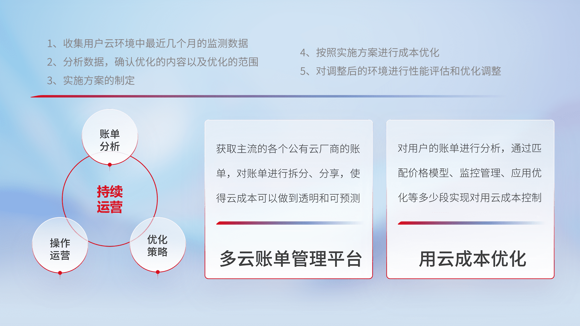 通过多云纳管,,以统一的资源数据模型把客户的云资源进行抽象和封装,,,,进而实现对多云资源的统一操作,,保障云资源管理的可靠性、、、、稳定性与可用性。。。量身定制化运维内容,,,配置、、、、开发运维、、、、补丁管理、、、、备份、、、、监控、、、、认证和访问管理、、审计和日常巡检等,,保障在用云过程中的可靠度,,稳定度以及高可用率。。。