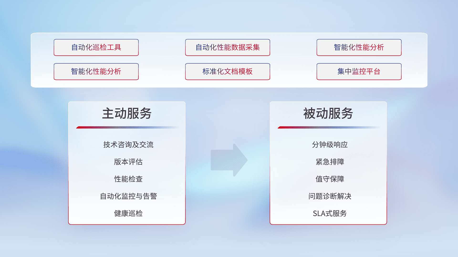 智能化工具和标准化文档,,,保障服务质量,,提供主动服务(包含技术咨询、、版本评估、、、性能检查、、自动化监控与告警、、健康巡检)和被动服务包含(分钟级响应、、、紧急排障、、、值守保障、、、问题诊断解决、、SLA服务)。。。